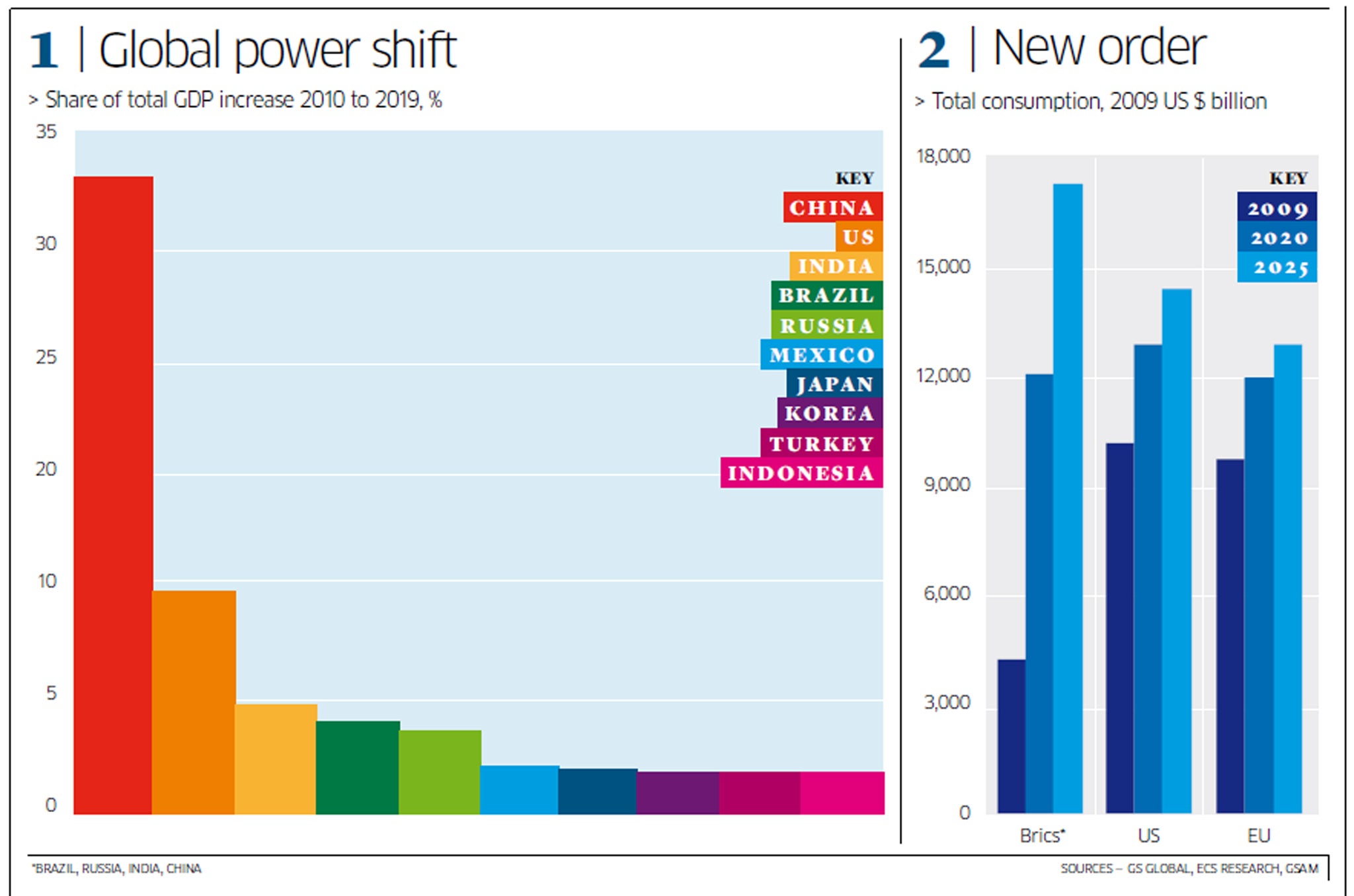 On the other chart you can see how this growth performance changes the relative pecking order between the US, the EU and the Brics. When the recession struck in 2009 the consumption of the Brics was still a lot smaller than that of either the US or Europe. In 2020 it will be roughly the same size, and by 2025 it is likely to be much larger.