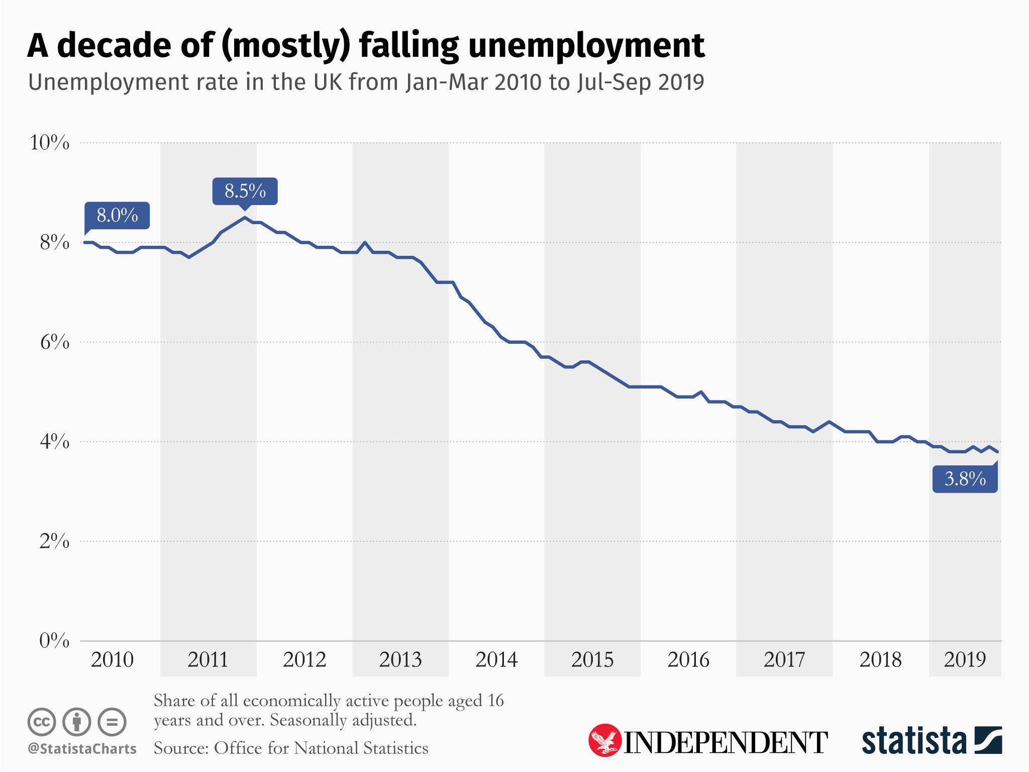 Yes, employment is up – to 32.5 million since we started the decade, from 29 million. Indeed, the creation of jobs and more jobs is our greatest economic success of the past 10 years. By 2015, David Cameron liked to say when he was prime minister, Britain had created more jobs post the financial crash than the rest of the EU put together. From 2015, the labour market has continued to improve. It’s enabled successive governments to proclaim that Britain’s economy is strong.