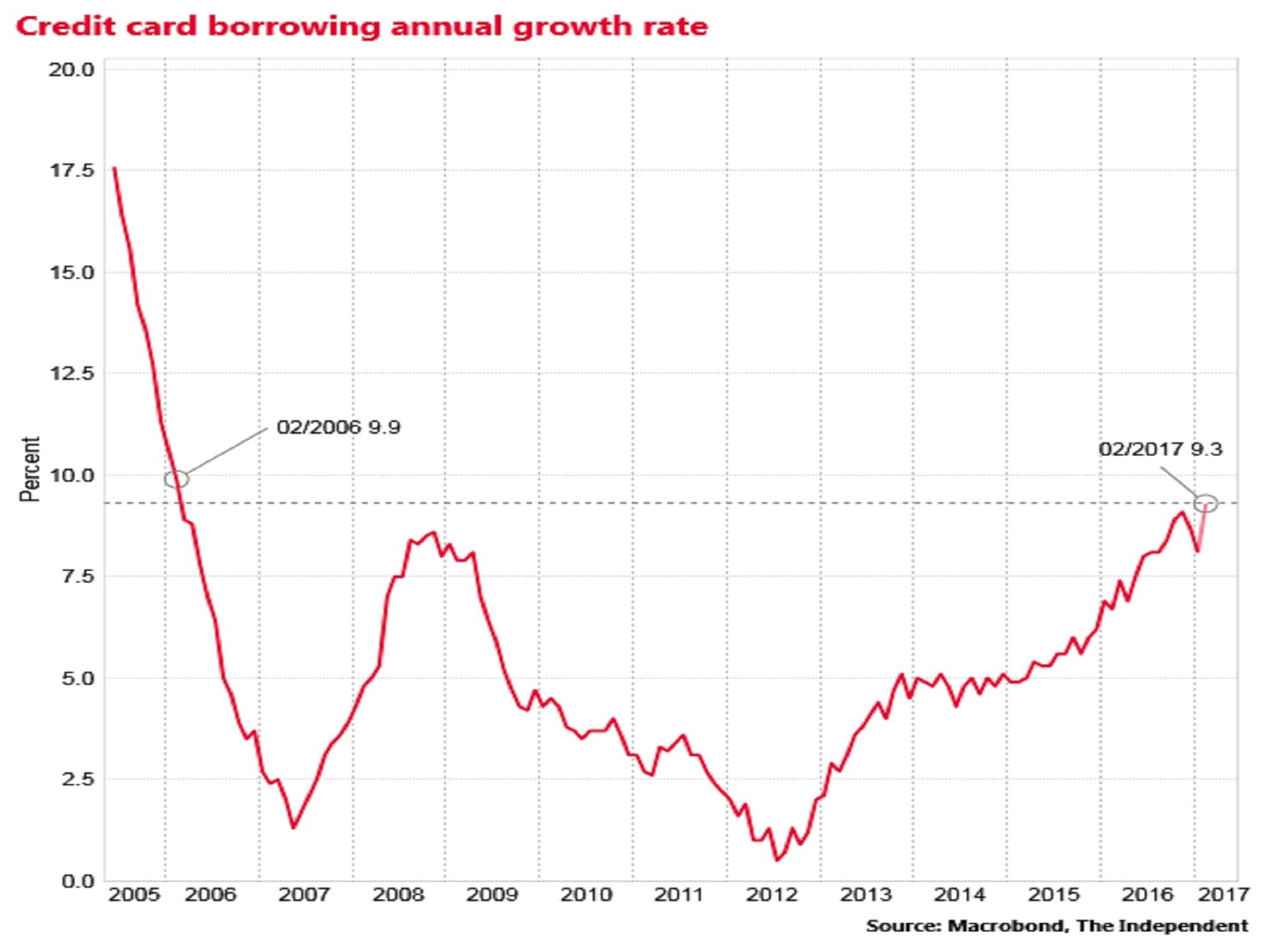 Credit card borrowing in February rose by £600m, taking the annual growth rate back to 9.3 per cent, the fastest in 11 years.