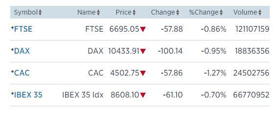 During European morning trade, the pan-European Stoxx 600 index was down 1.2 per cent, the lowest in more than three weeks.