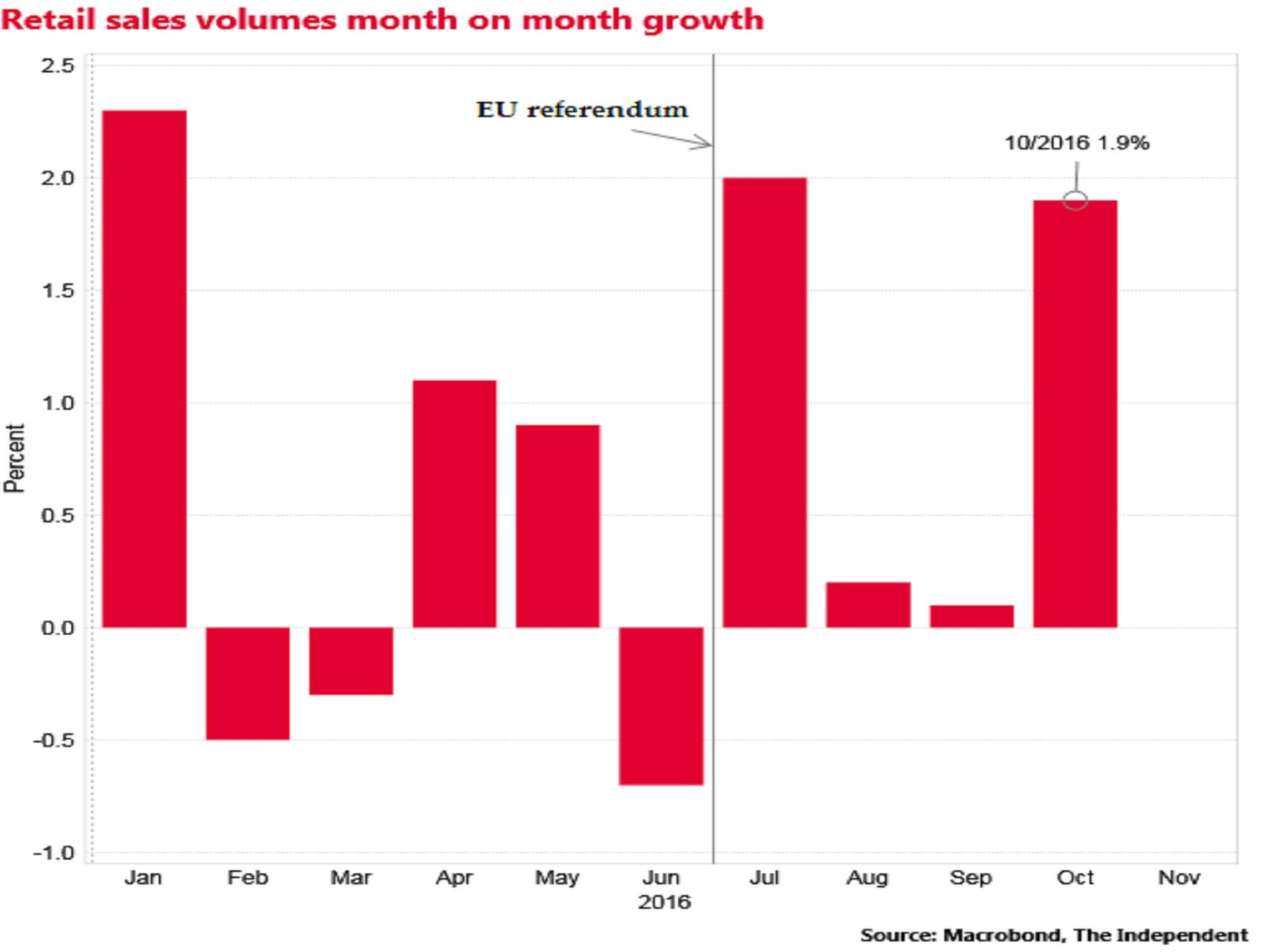 Retail sales surged by 1.9 per cent in October, far outstripping City analysts' expectations and showing continued strength of household consumption despite the Brexit vote.