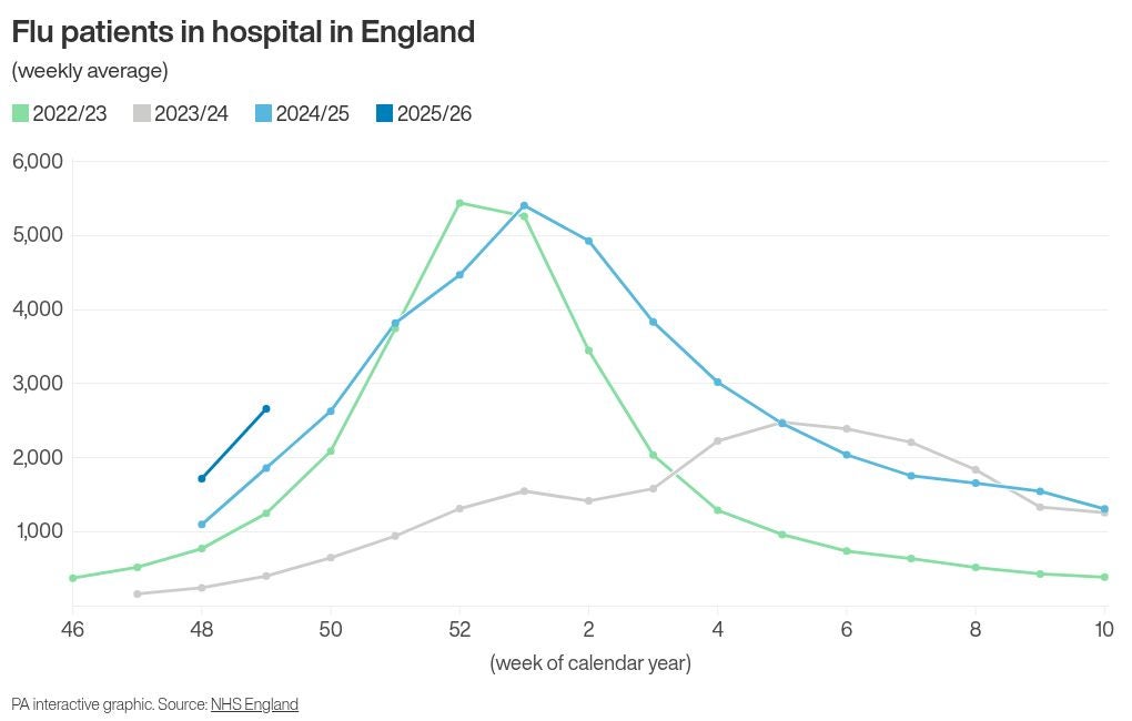 Health Secretary Wes Streeting warned of "a tidal wave of flu tearing through our hospitals" as an average of 2,660 flu patients were admitted daily last week, up from 1,717 the week prior. This compares to 1,861 patients at the same point last year, and just 402 in 2023.