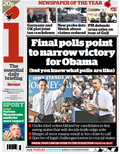Last time round 131.1m people turned out — that's 58.2 per cent of the electorate, compared with 65.1 per cent in our previous general election. But this vast vote will be decided by a few swing states: Ohio, Virginia, New Hampshire, Wisconsin — all, bar Florida, holding relatively few electoral college votes. A crazy system? Who are we to talk about voting systems?
