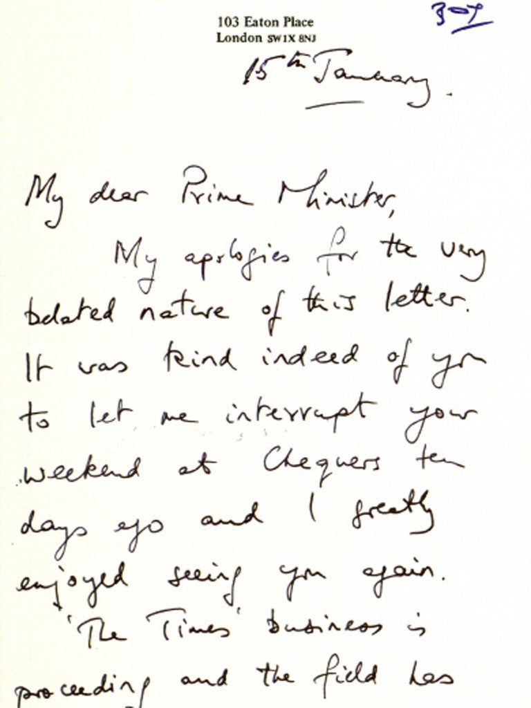 Mr Murdoch also speculated on who his rival bidders might be. They included the tycoon Robert Maxwell, who later bought the Daily Mirror, and Sir James Goldsmith, father of the current Tory MP Zac Goldsmith. The note records that Mrs Thatcher "thanked Mr Murdoch for keeping her posted" but "did no more than wish him well in his bid."
