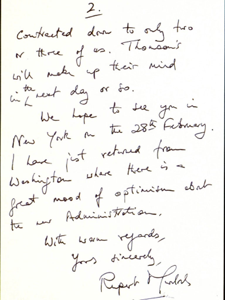 Mr Murdoch wrote to her on 15 January, to inform her that "The Times business is proceeding well", adding: "See you in New York on 28 February." By then, the deal had been clinched.