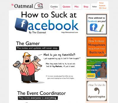 2. How to Suck at Facebook - The Oatmeal - a comic hosted on The Oatmeal that stereotypes common Facebook user profiles and explains why you don't want to be friends with them.