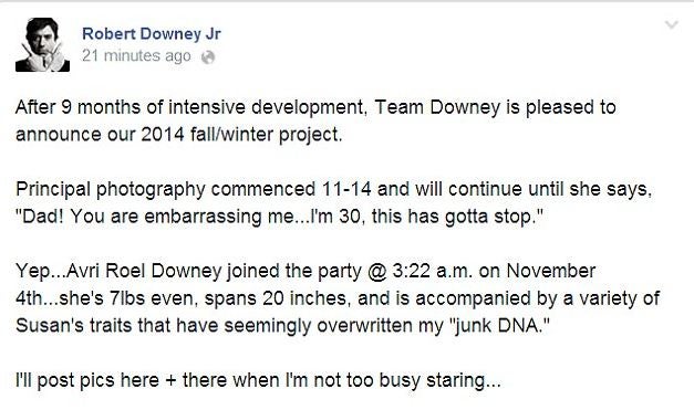 “Yep... Avri Roel Downey joined the party @ 3:22 a.m. on November 4th,” he wrote on his official Facebook page.