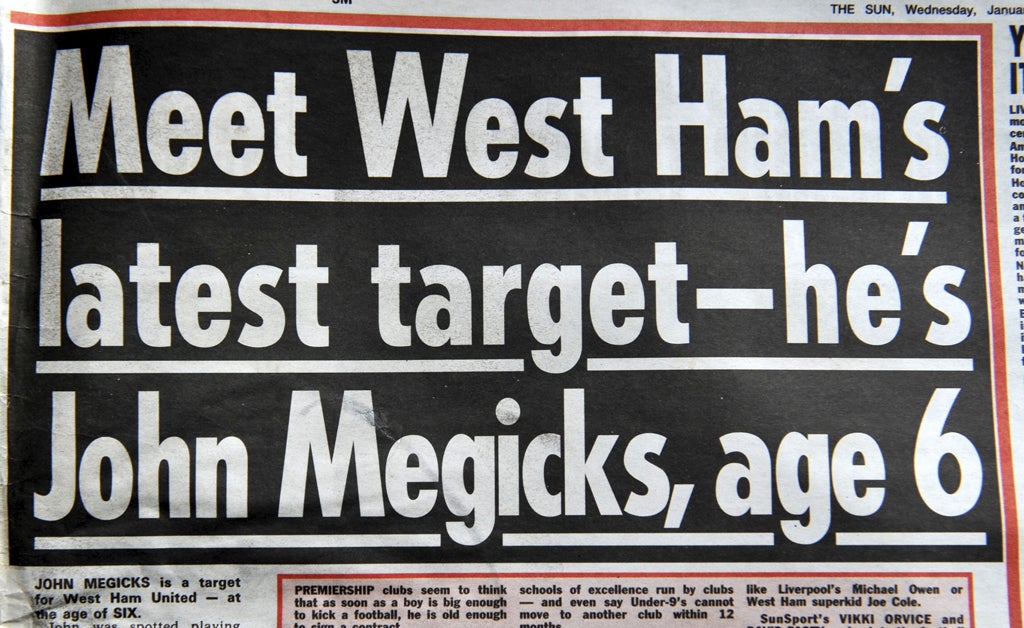 Back in 2001, his starring role in Hansen's documentary was not his first brush with fame. He had first come to prominence when, two years earlier, The Sun devoted two pages of its sports pages to the battle between West Ham and Spurs for Megicks' signature with the headline "Meet West Ham's latest target – he's John Megicks, age 6".