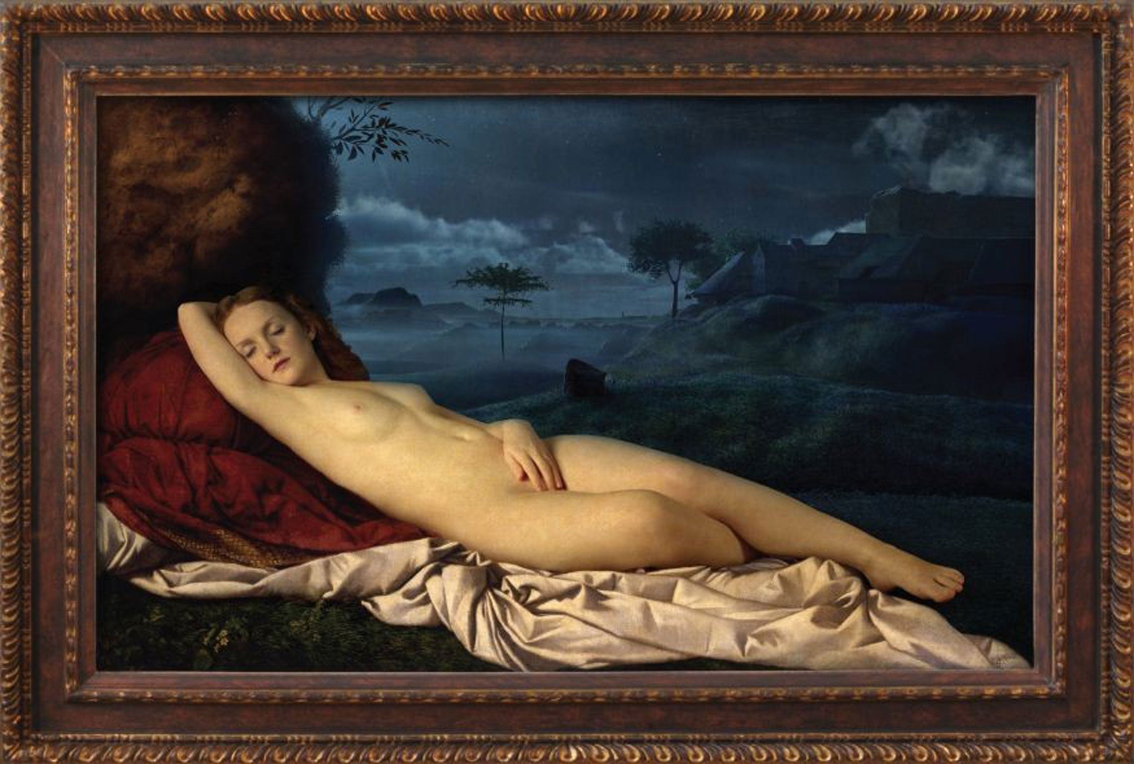To create an extraordinarily complex work they turned to MPC, a British Oscar-winning visual effects company, who turned life model Ivory Flame into the sleeping Venus using green-screen technology. Her chest rises and falls, her hand moves and her foot twitches. Behind her, day turns to night, clouds move across the sky and the grass and trees ripple in a breeze thanks to computer-generated imagery.