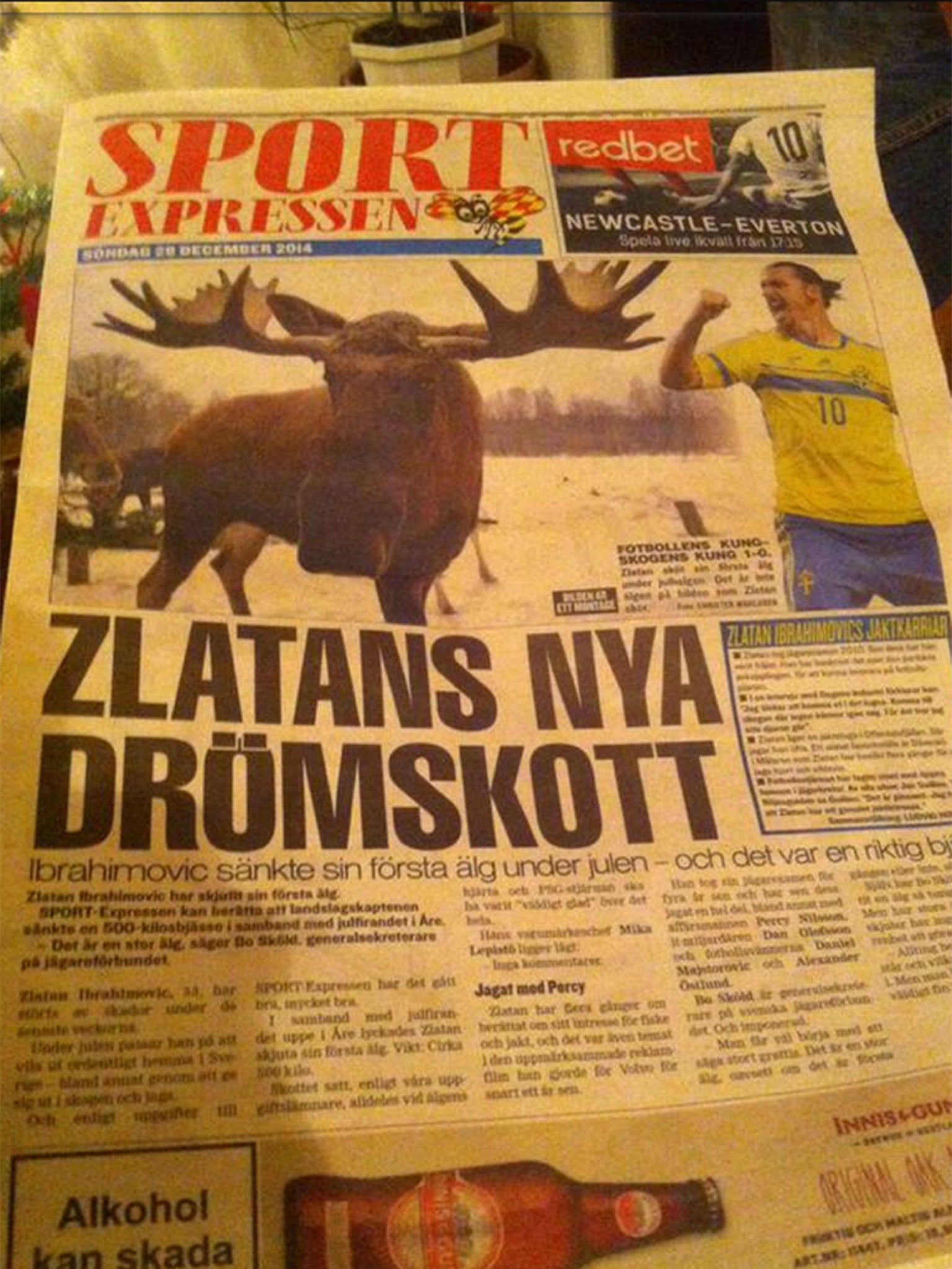 The 33-year-old returned to him homeland where it's alleged he went on a hunting trip during which he shot dead the moose. The story ran on the front page of Swedish newspaper Expressen over the weekend. The report said the animal was killed “with one shot through its heart” and that Ibrahimovic was "very happy" with his trophy.