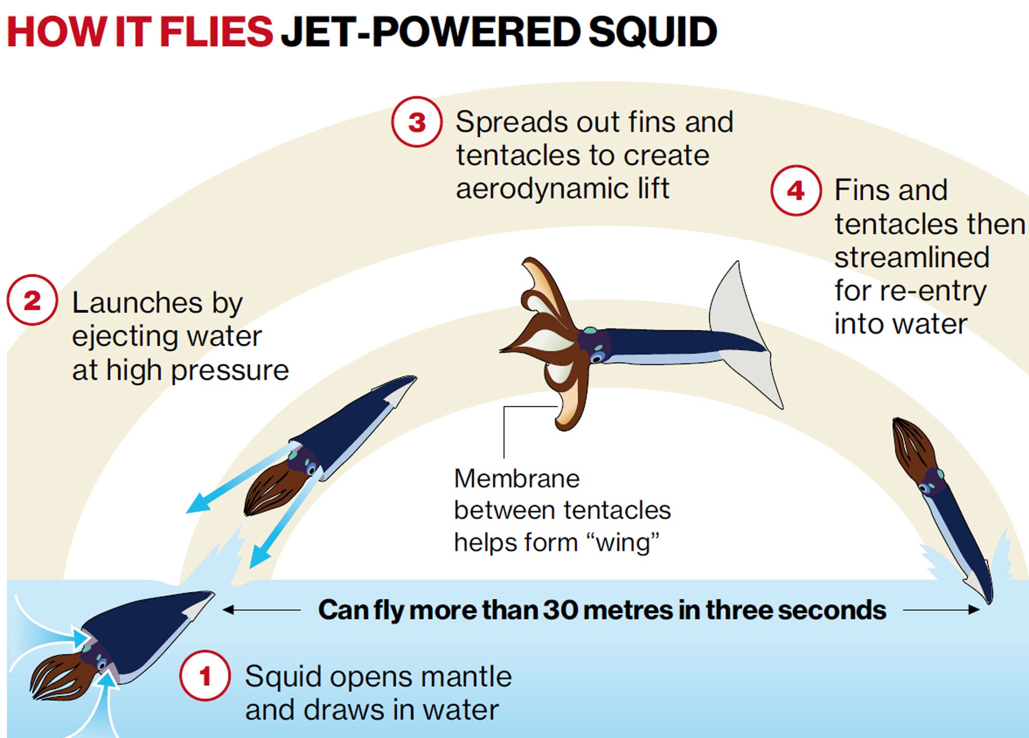 The squid, which normally swims backwards through the water using its fins, can eject water through a nozzle near its head as a form of jet propulsion in emergencies. It is this technique they use to glide through the air like flying fish.