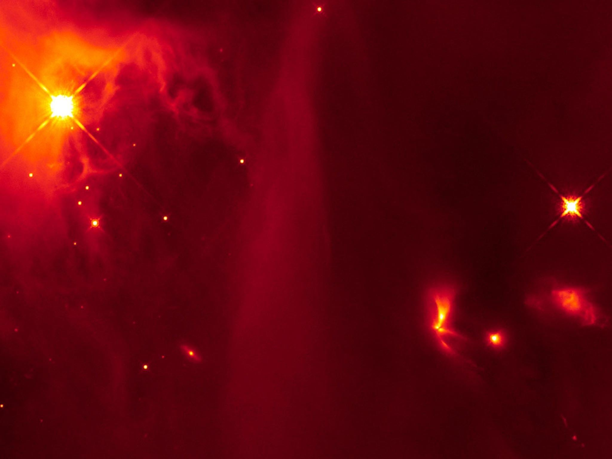 The image shows the star HD 184738, otherwise known as Campbell’s hydrogen star. It is seen surrounded by a plume of reddish gas, including hydrogen and nitrogen.