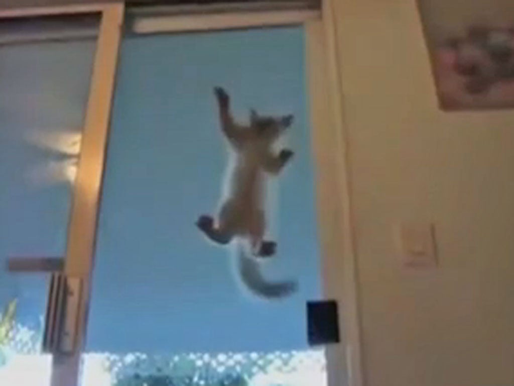 A cat performs amazing moves like Spiderman to let himself inside the house.