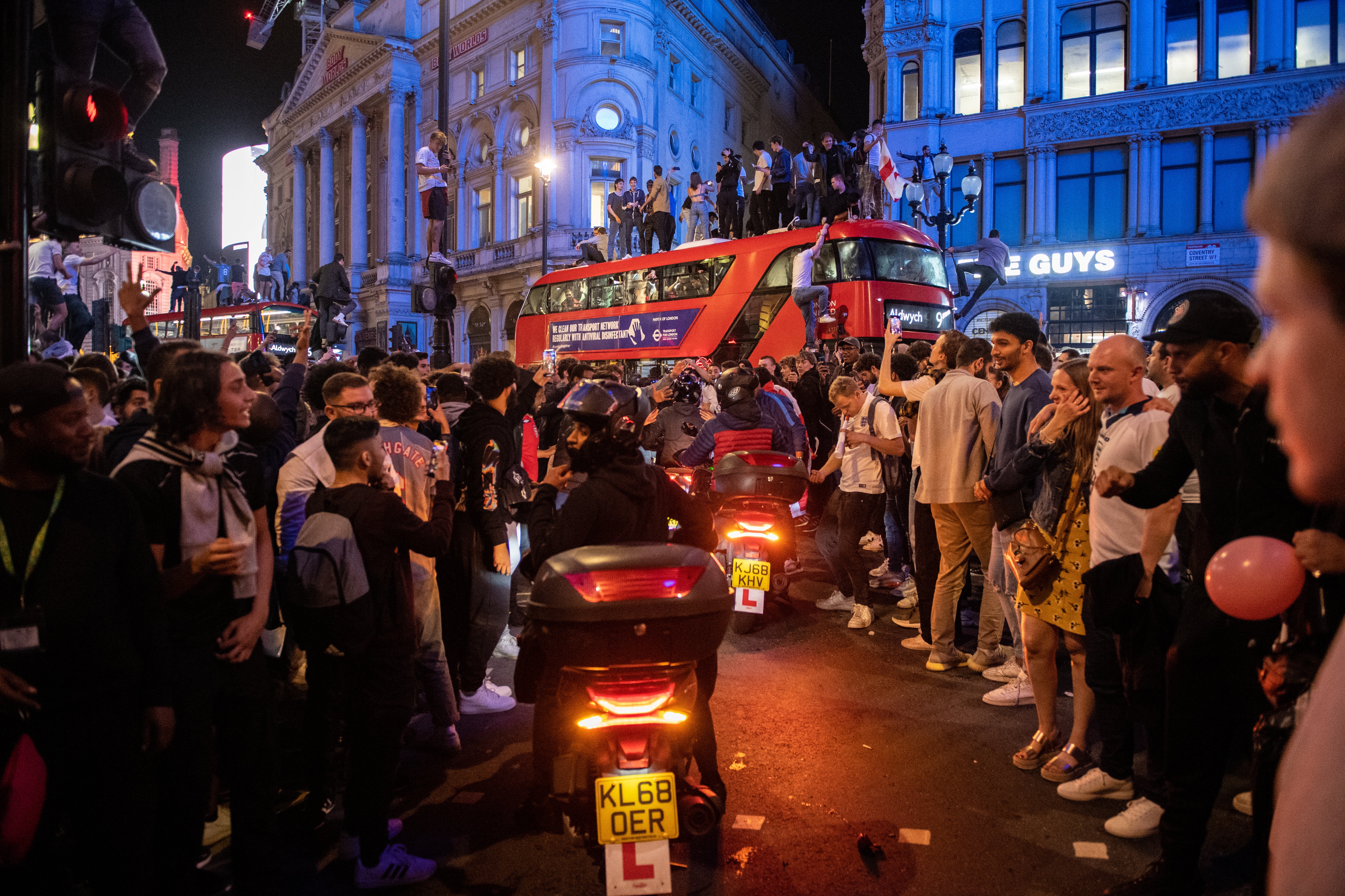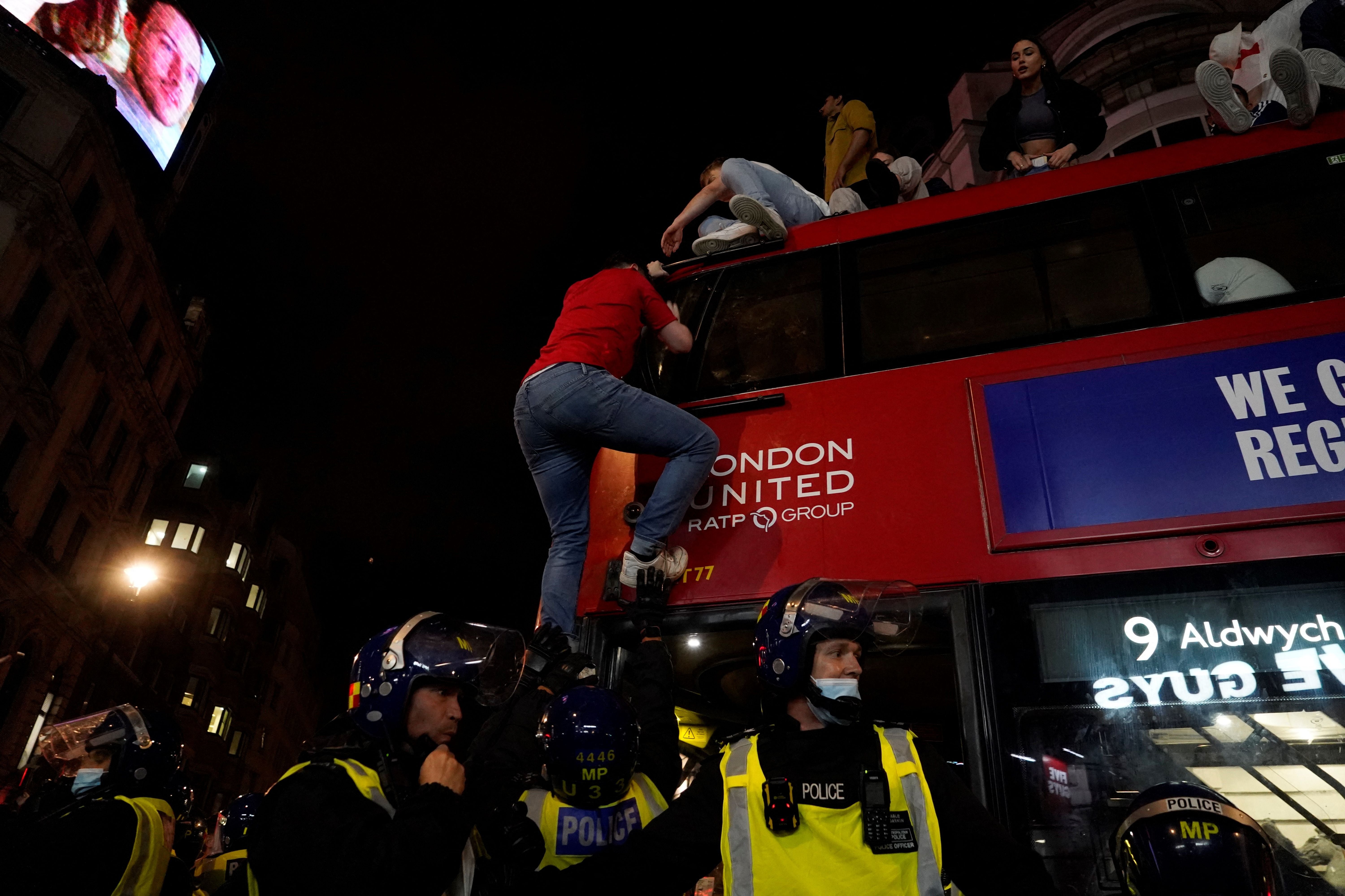 In London, supporters commandeered several stationary London buses off Picadilly Circus, climing ontop of them and waving the England flag, before riot police were called and they were forced to come down.