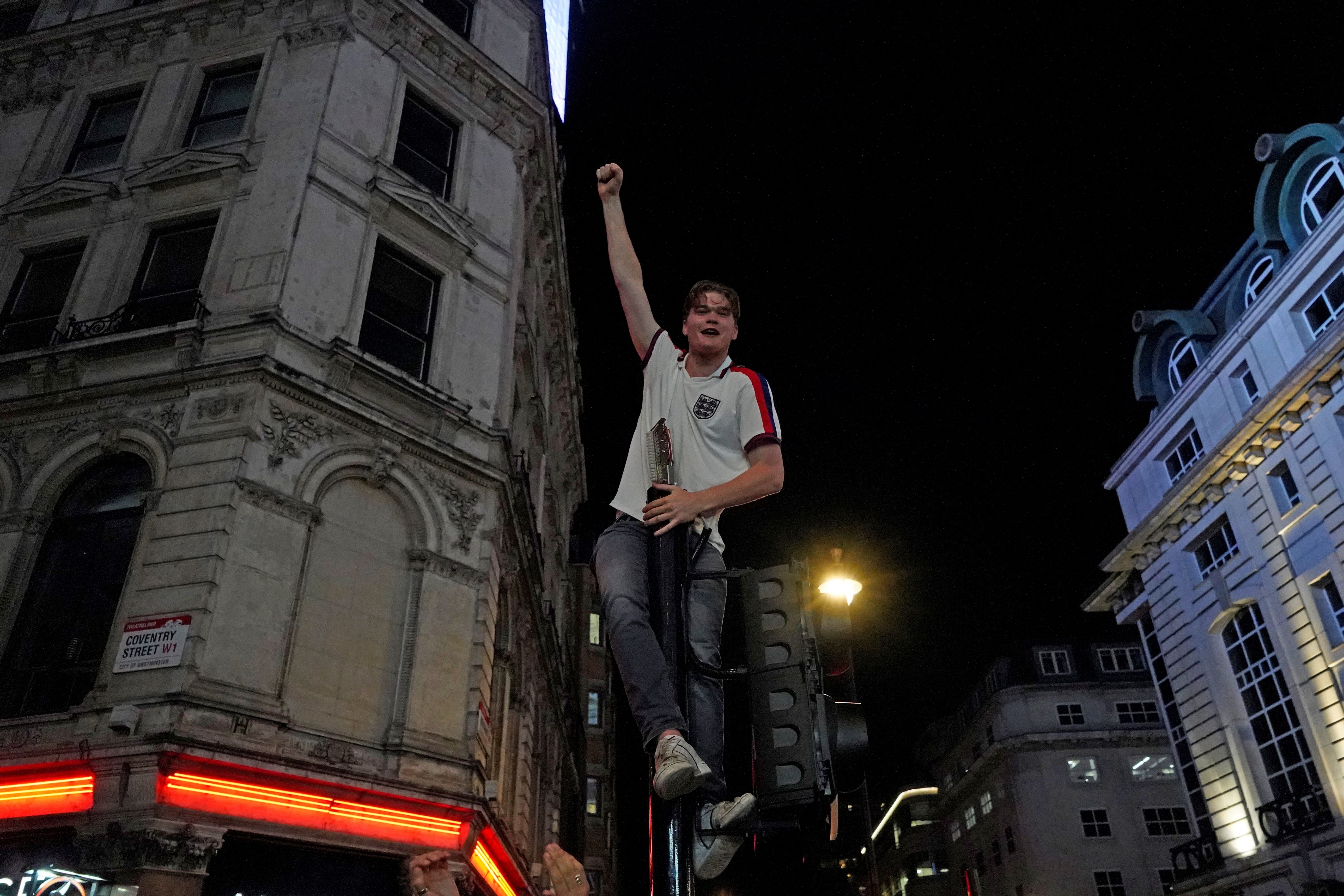 In pictures: Atop London buses and up street lamps, England fans celebrate win over Denmark