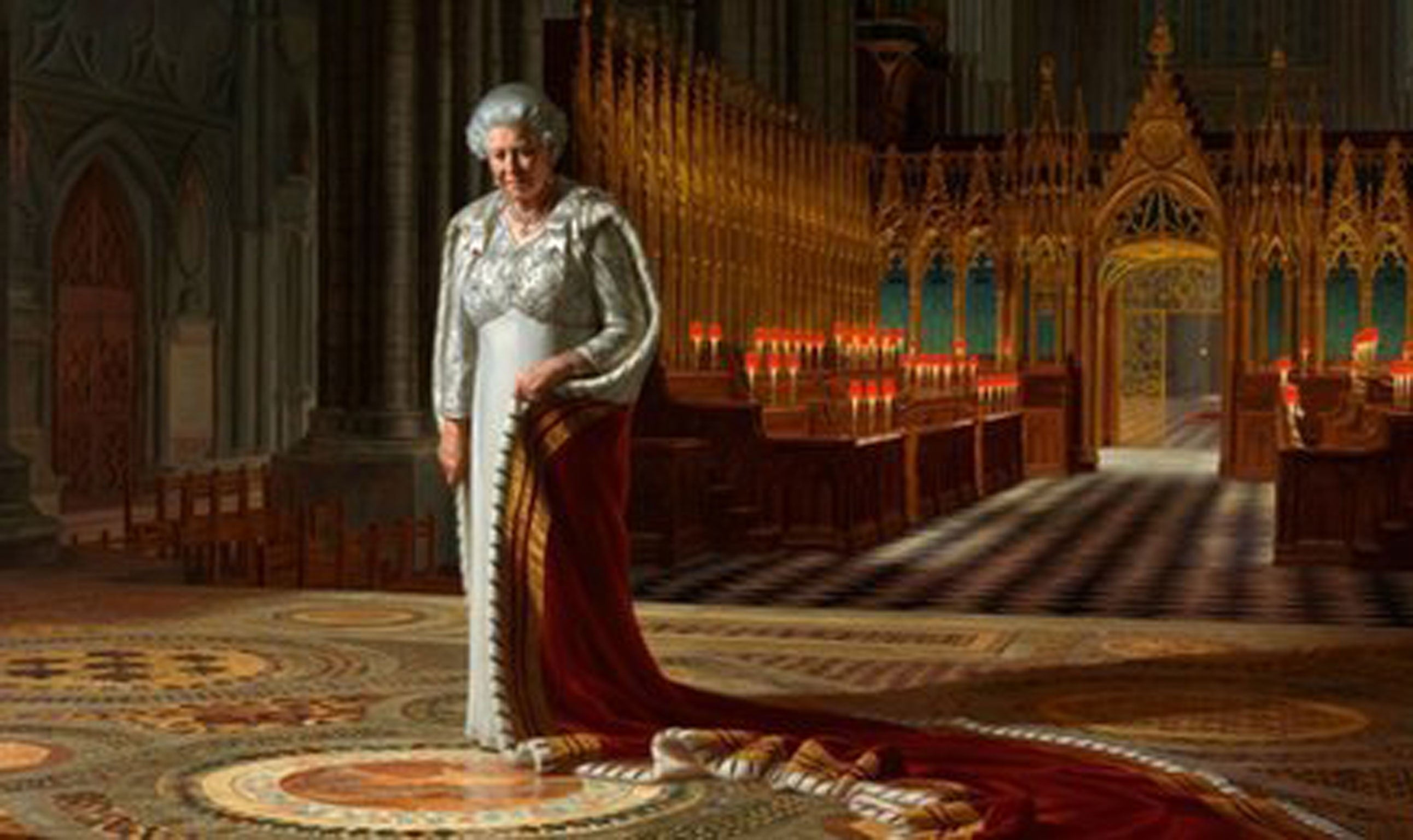 The work depicts the Queen in a moment of solitary reflection, standing at the centre circle of the Cosmati pavement, on the exact spot she was crowned.