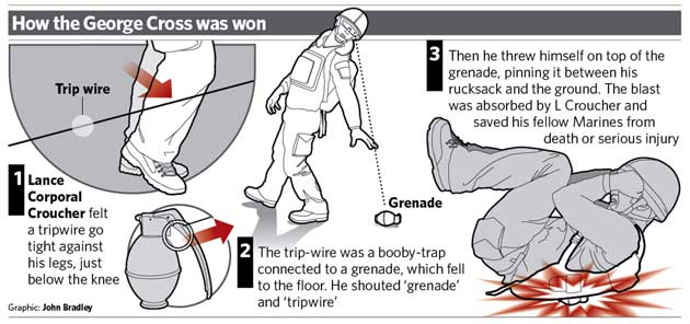 L/Cpl Croucher, from Birmingham, was awarded the George Cross yesterday for what was described as an act of "extraordinary bravery and sacrifice". He is the first reservist to receive the military's highest honour, alongside the Victoria Cross, in the current conflicts in Afghanistan and Iraq.