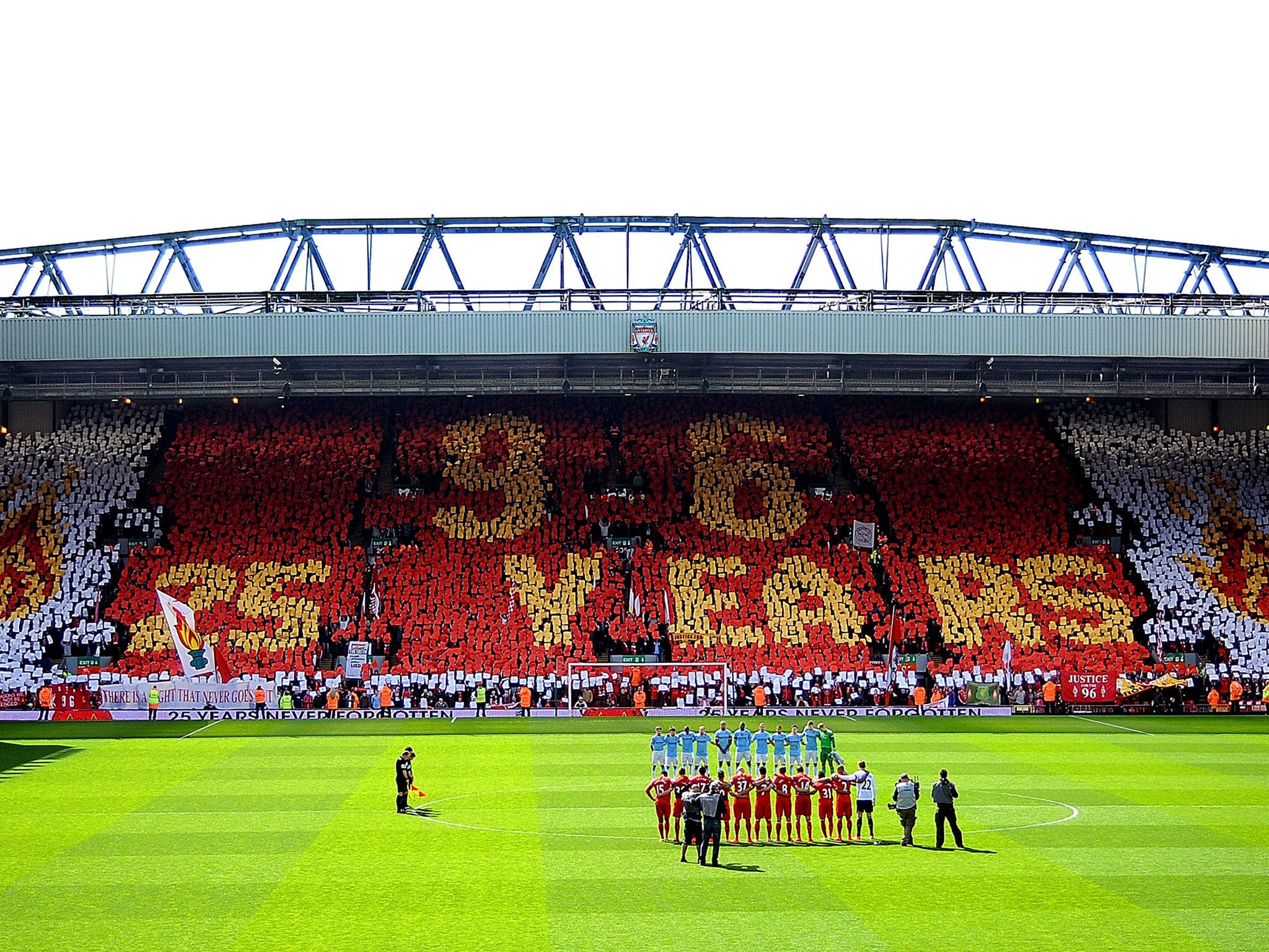 In a celebration inspired by the one-mile chain of scarves between Goodison Park and Anfield, created a week after the disaster and started by the then Everton star Ian Snodin, scarves were laid out on the Anfield turf in the shape of the number 96.