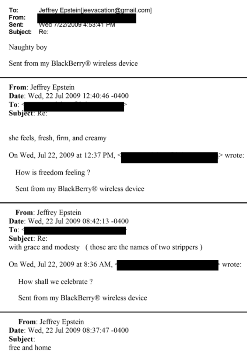 The then-business secretary appears to reply “How shall we celebrate ?”, to which Epstein responds “with grace and modesty ( those are the names of two strippers )”.