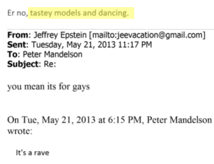 The former minister attempts to explain that it is “a rave”. Epstein asks if means “its for gays”, to which Lord Mandelson says: “Er no, tastey [sic] models and dancing.”