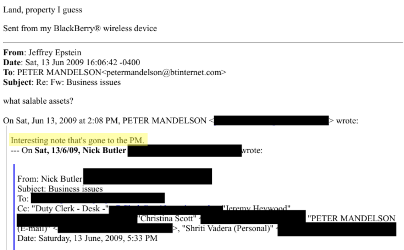Epstein asks for clarification on this, before the reply email says: “Land, property I guess.”