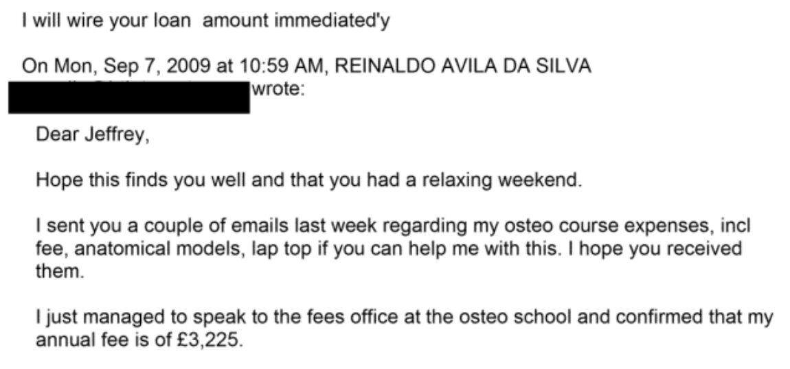A few years later, in 2009, Mr Da Silva would request help from Epstein to pay for his osteopathy course, which the financier gladly did.
