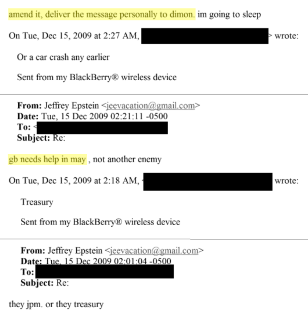 The financier warns that “gb [Gordon Brown] needs friends in May”, referring to the upcoming general election, then orders the business secretary to “amend it” and “deliver the message personally to dimon”, referring to Jamie Dimon, who has been CEO of JPMorgan Chase since 2006.