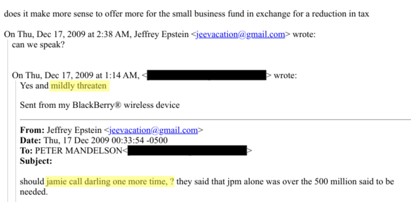 A few days later, Epstein asks Lord Mandelson if Mr Dimon should call then chancellor Alistair Darling “one more time” about the issue, to which the minister replies: “Yes and mildly threaten.”