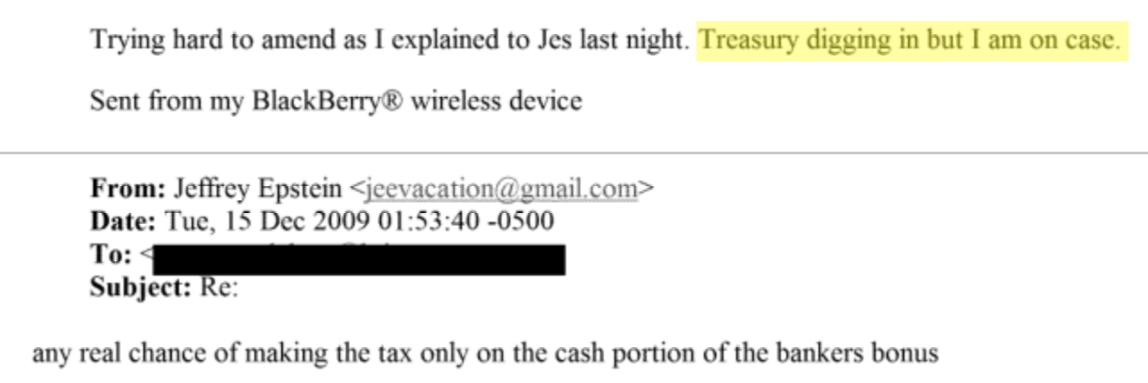 Over several days in December 2009, Epstein asked Lord Mandelson to lobby the government to amend the upcoming bank bonus tax so that it only applied to cash bonuses, rather than non-cash elements such as share options which were often more valuable.