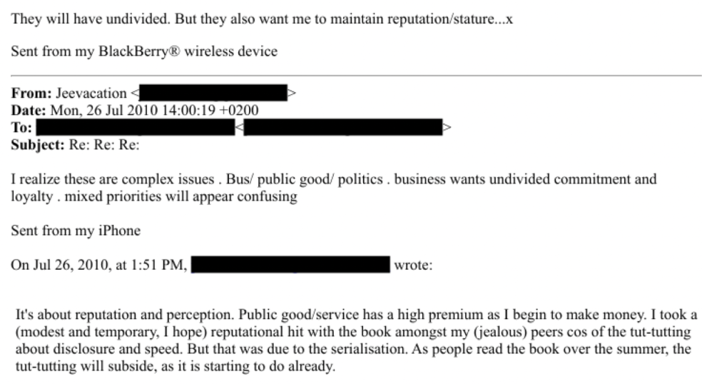 In an exchange about the former minister’s options, he explains that there is “high premium” from his time in public service. Epstein replies that businesses expect “undivided commitment” from employees, to which Lord Mandelson says “they will ... But they also want me to maintain reputation/stature...x”.