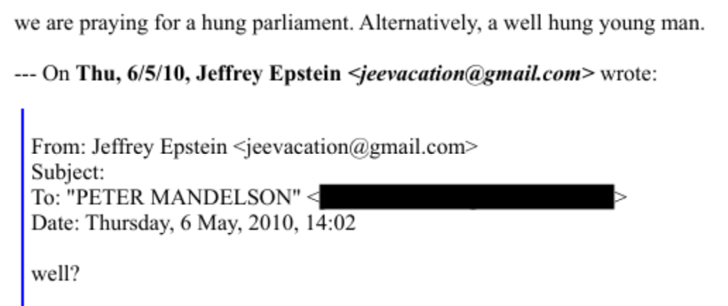 On the day of the 2010 general election, 6 May, Epstein emailed Lord Mandelson for an update, asking “well?”