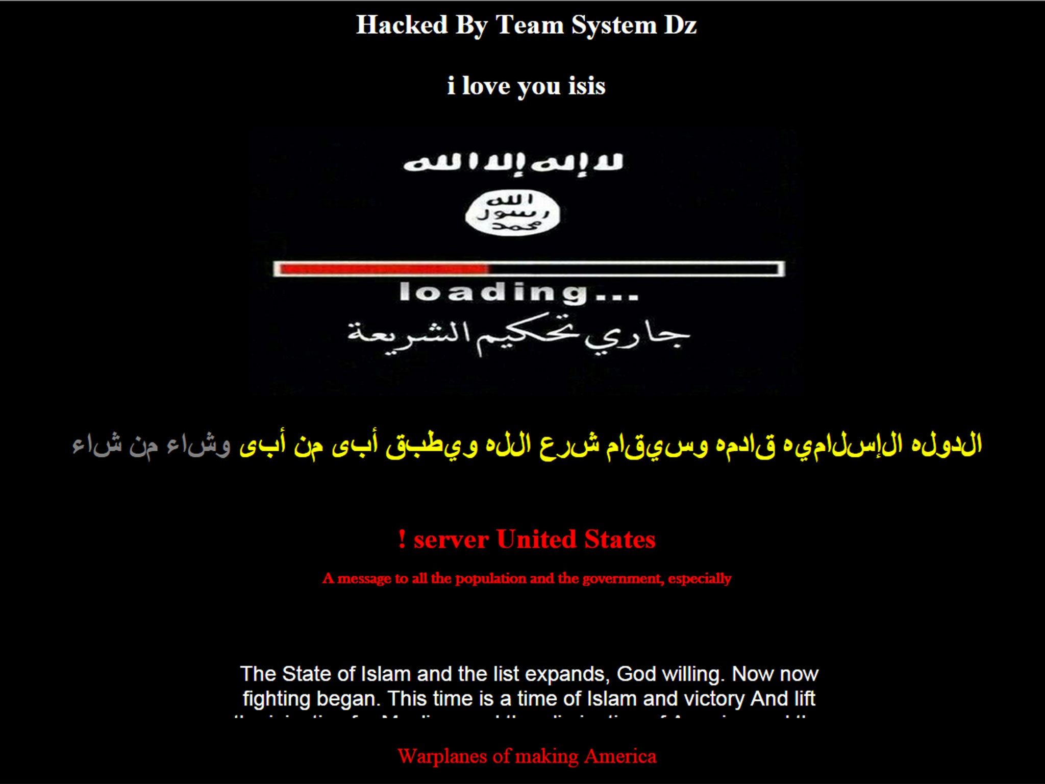 Web users landing on the homepage are greeted by a black screen overlaid with images reportedly showing US warplanes, Muslim homes in conflict areas and women and children casualties. The words “Hacked By Team System DZ” are written at the top of the page and music plays in the background.