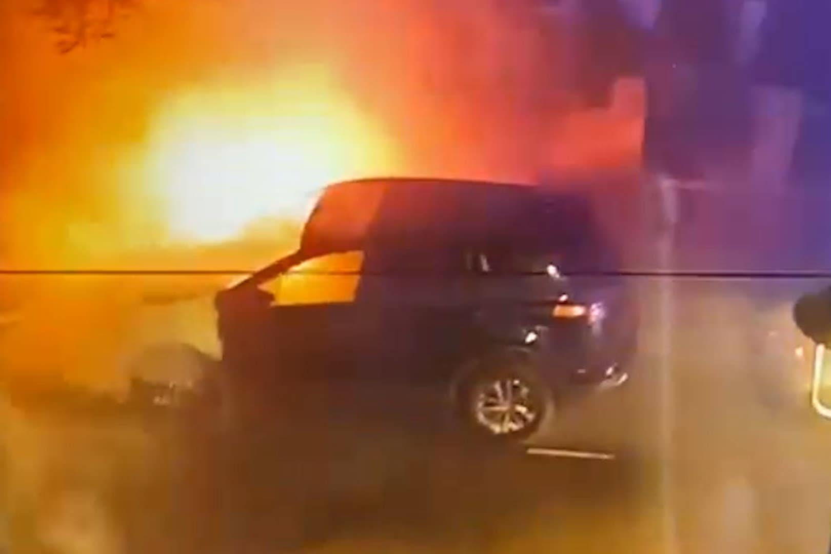 Dramatic footage captured by a neighbour shows firefighters tackling the burning car.