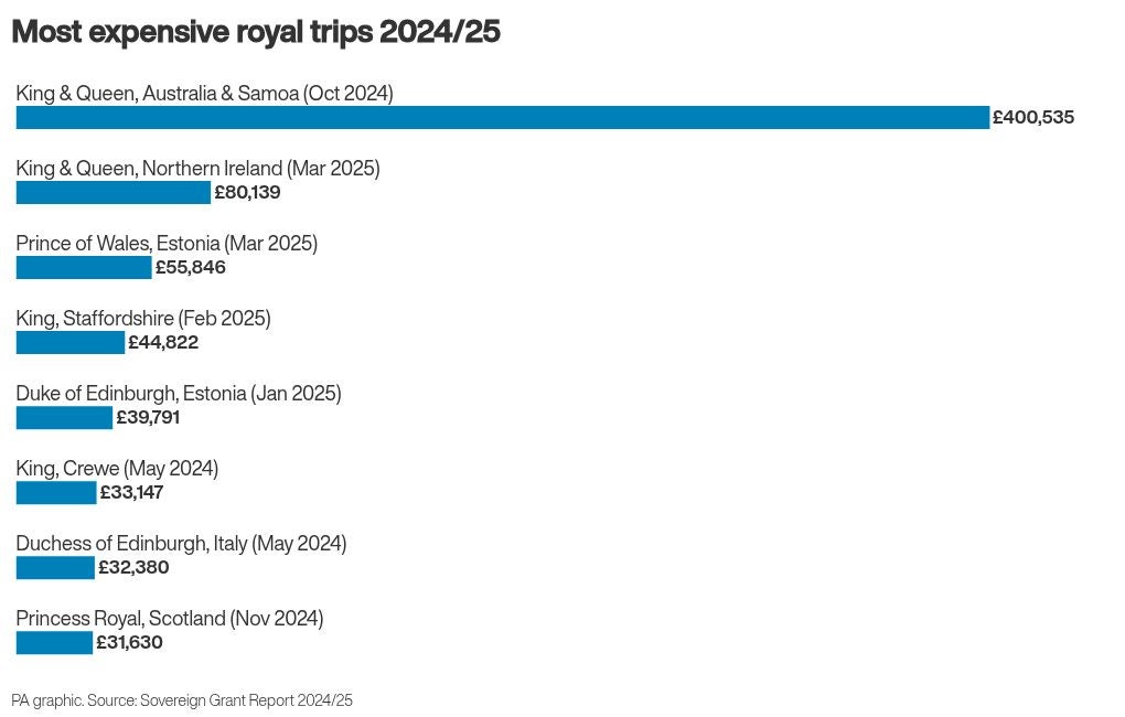 Completing the top five are a two-day trip by the King on the royal train in February 2025 to Staffordshire, to visit the JCB factory in Rocester and the Tower Brewery in Burton upon Trent, which cost £44,822; and a two-day trip by the Duke of Edinburgh to Estonia in January 2025 to visit the Royal Dragoon Guards while on a military operation, which cost £39,791.