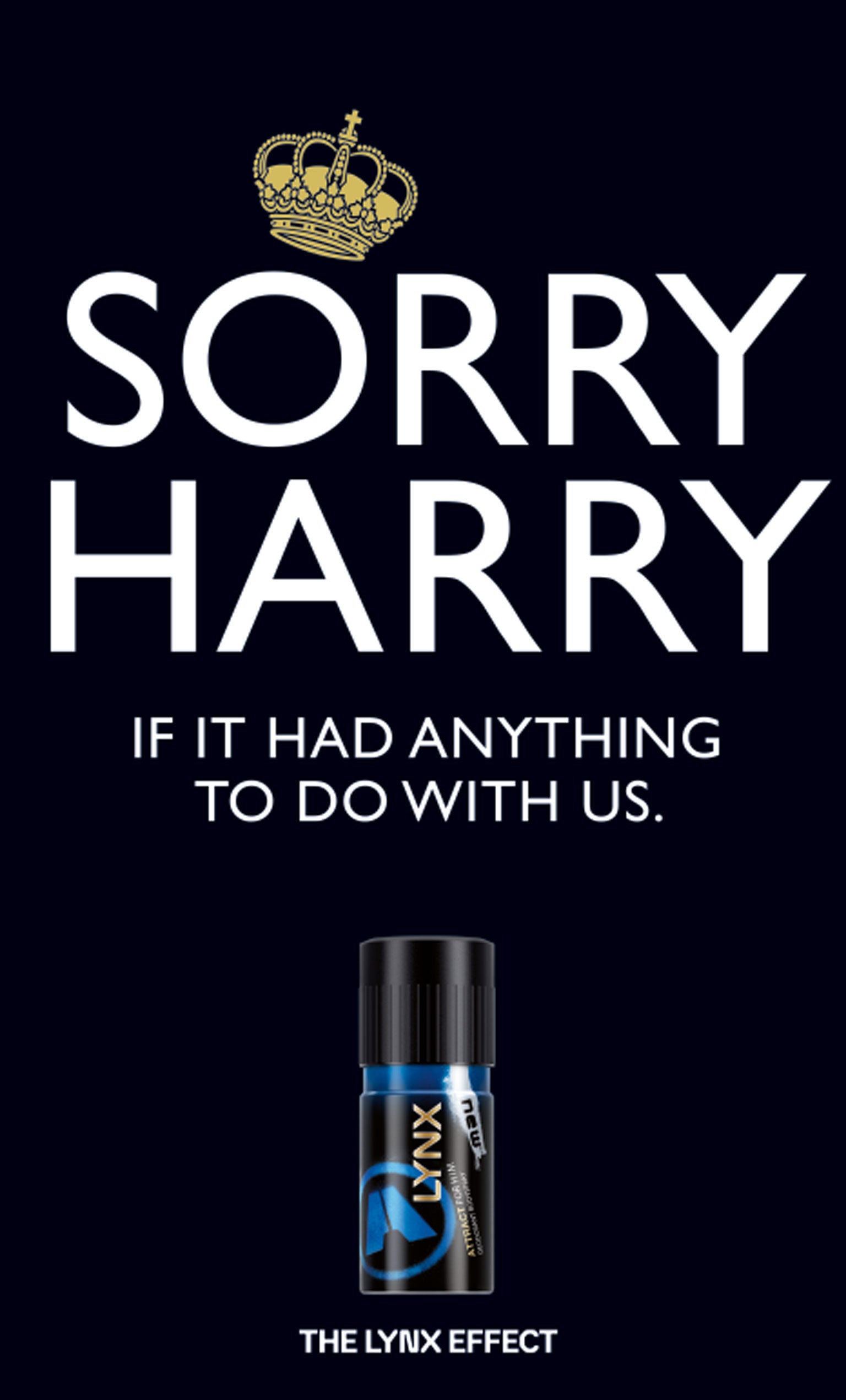 Less than three days after the photos of a naked Prince Harry at a Las Vegas party appeared online, Lynx responded with a parody of the ‘Keep calm and carry on’ posters. It’s message? “Sorry Harry if it had anything to do with us”.