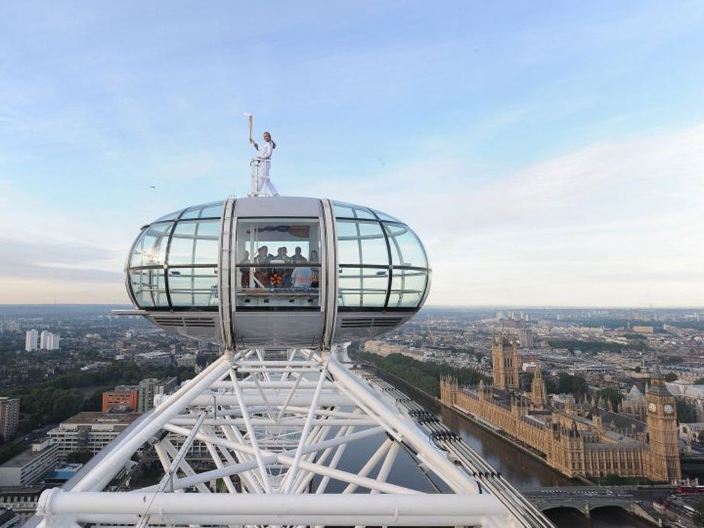The Olympic Torch reached new heights this morning as it was held aloft on the London Eye.