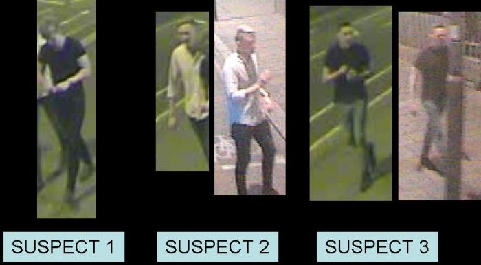 All three suspects have been described as white, slim built, and in their early 20s. Two of the suspects have short, light-coloured hair and the other has dark-coloured hair.