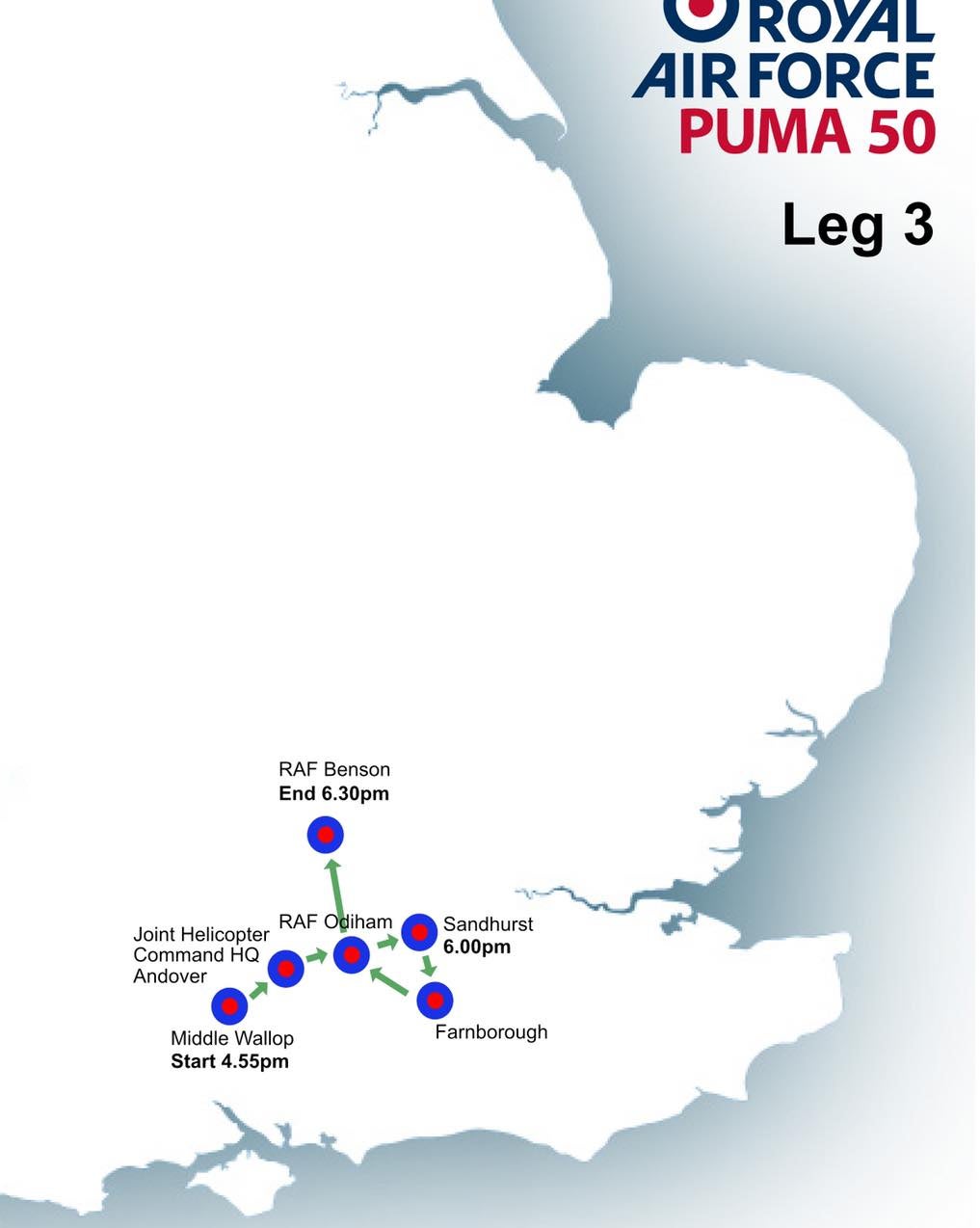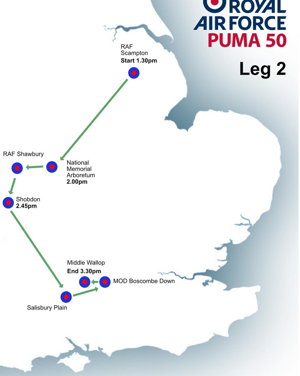 In the second leg, it the helicopters scheduled to leave Scampton at 1.30 pm and to fly past the National Memorial Arboretum, Shawbury, Shobdon, Salisbury Plain, Boscombe Down, and end at Middle Wallop at 3.30pm.