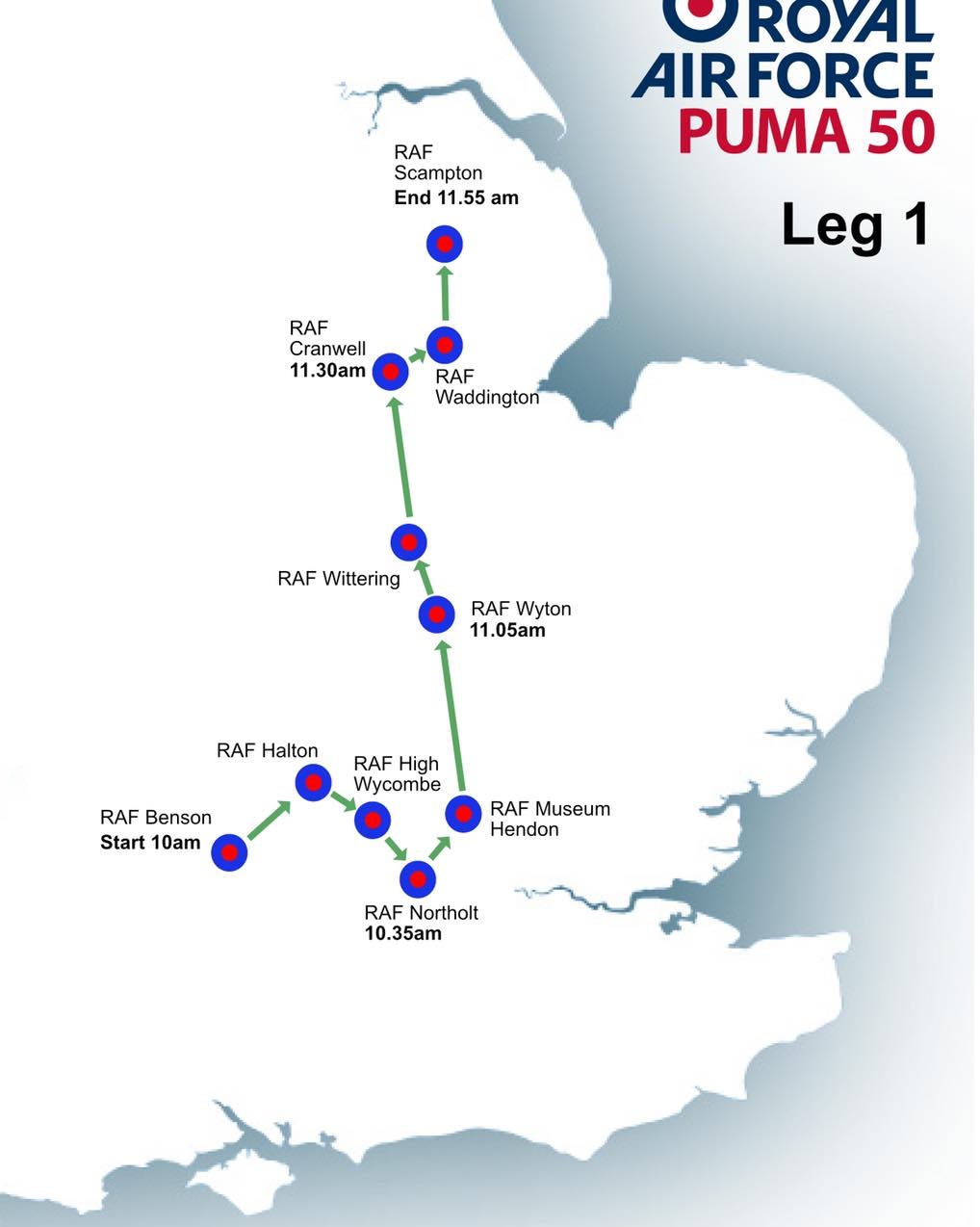 The flypast will consist of three legs, with the first beginning at RAF Benson around 10am. It is scheduled to proceed through Halton, High Wycombe, Northolt, Hendon, Wyton, Wittering, Cranwell and Waddington before ending at RAF Scampton around 11.55am.