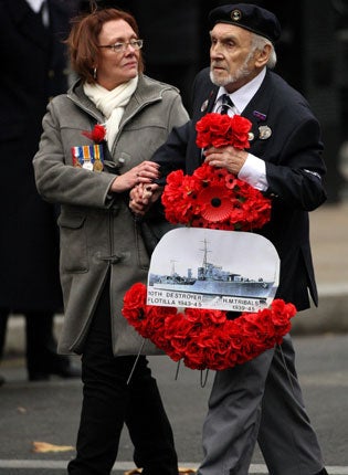 The 85-year-old former infantryman, with a row of five medals glistening on his chest, was one of dozens yesterday whose Remembrance Sunday route through central London to participate in two minutes of silence in Whitehall included a detour to the neat rank of rain-streaked crosses, each adorned with a photograph of one of the 231 soldiers killed in Afghanistan since 2001.