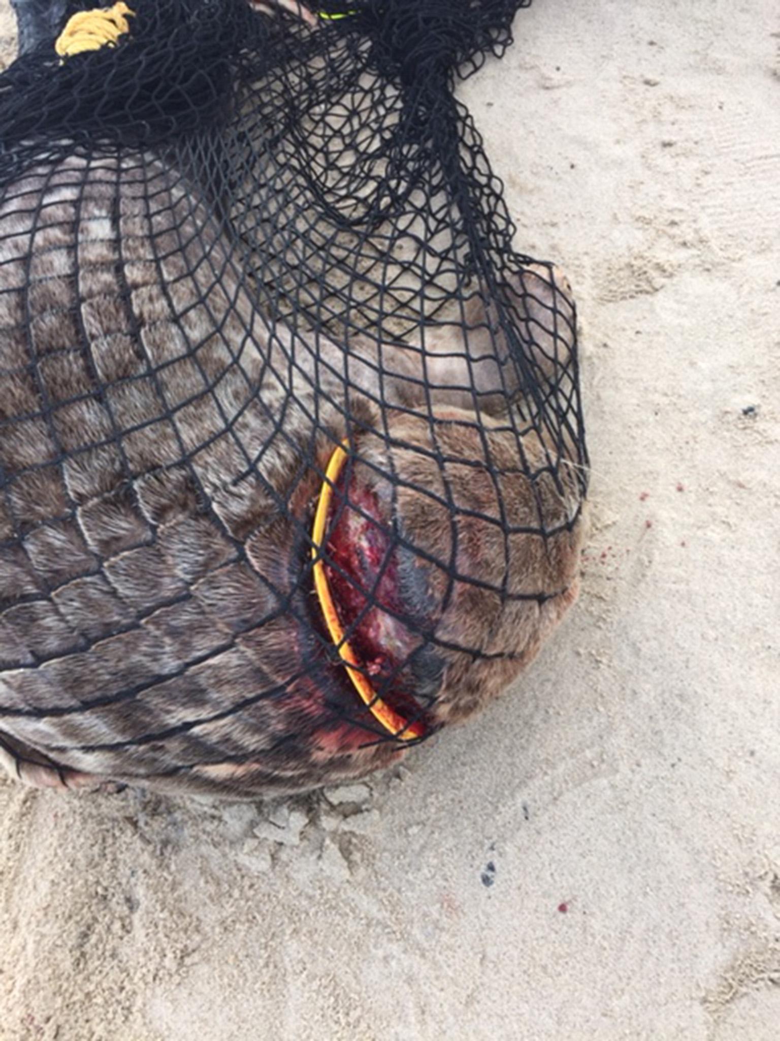 Rescuers had to wait until the 125kg marine mammal had become weakened by its injuries before they could move in with a net and then surgically remove the plastic toy.