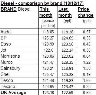 Diesel averaged 123.2p per litre this week, compared with 118.4p last year and 106.8p in 2015, according to the AA’s Fuel Price Report.