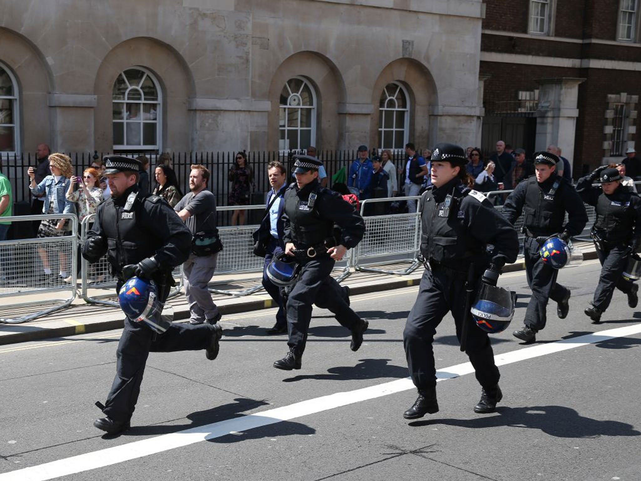They were escorted by Metropolitan Police officers and vans, while a force helicopter followed overhead.