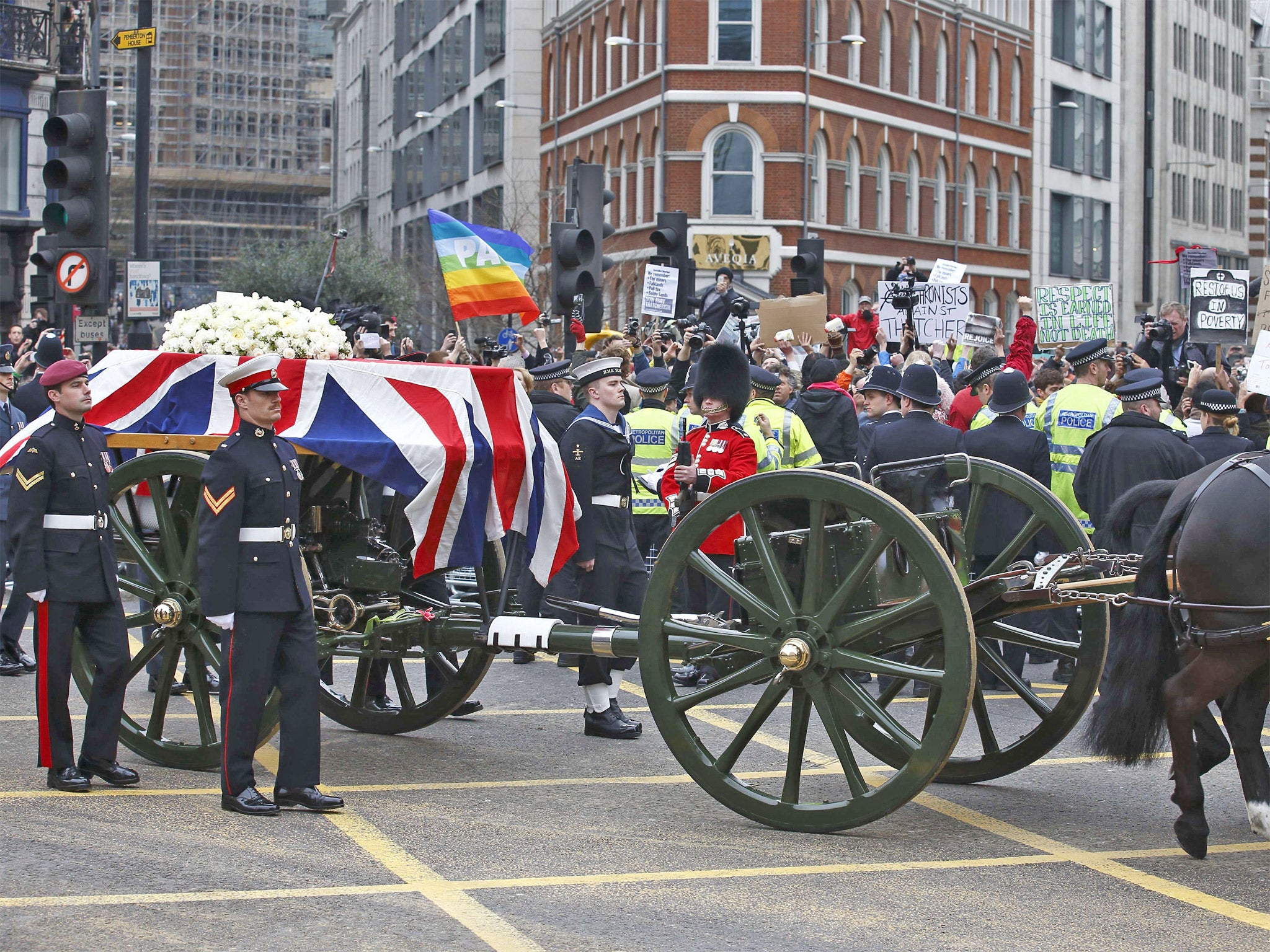 A quintessentially British protest as thousands line streets to witness Margaret Thatcher's final journey