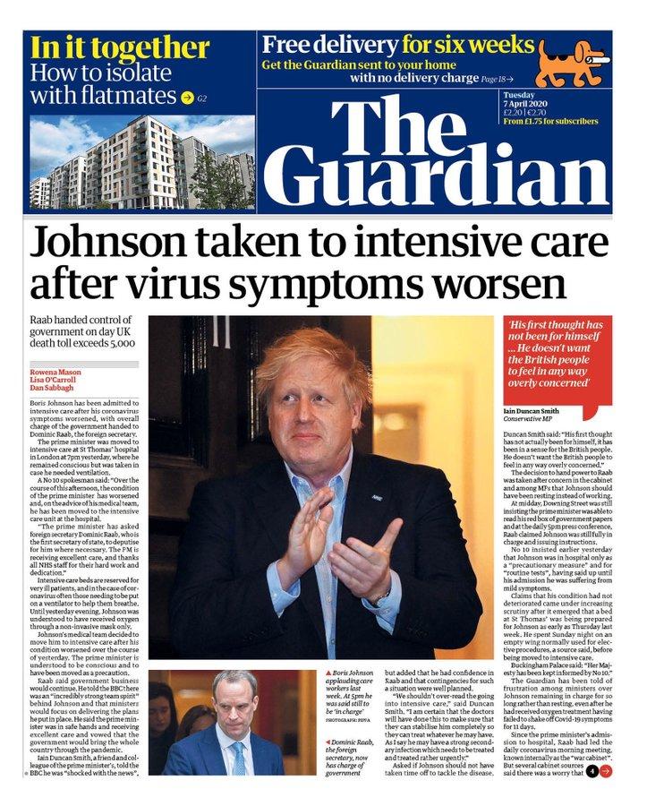 “With the prime minister’s condition worsening Monday, Britain plunged into a harrowing new phase in its struggle against the coronavirus,” The New York Times wrote in its lead article on the PM’s health.