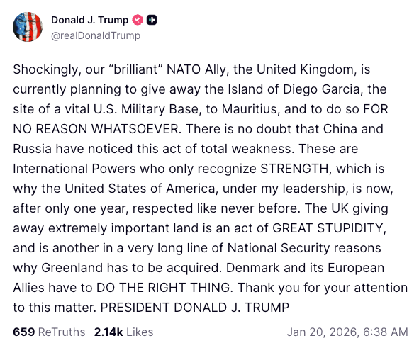 “The UK giving away extremely important land is an act of GREAT STUPIDITY, and is another in a very long line of National Security reasons why Greenland has to be acquired. Denmark and its European Allies have to DO THE RIGHT THING.”