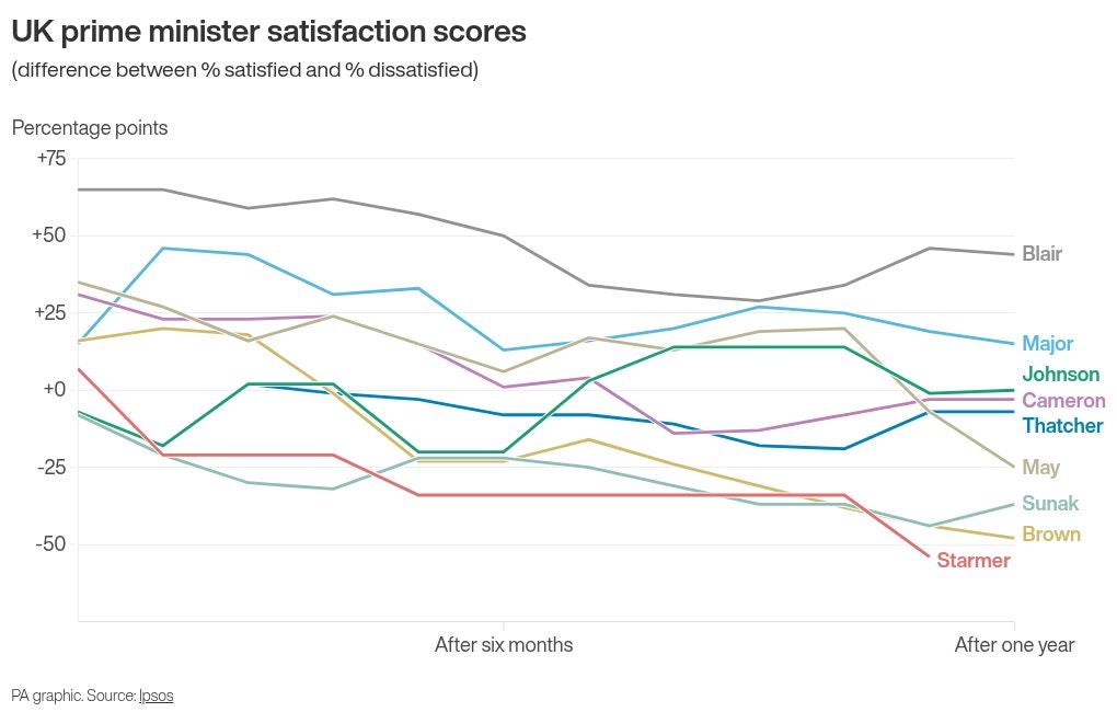 The most recent Ipsos survey, completed in early June – not quite a full year since the general election – suggests 19% of adults are satisfied with Sir Keir’s performance and 73% are dissatisfied, giving him a net approval score of minus 54.
