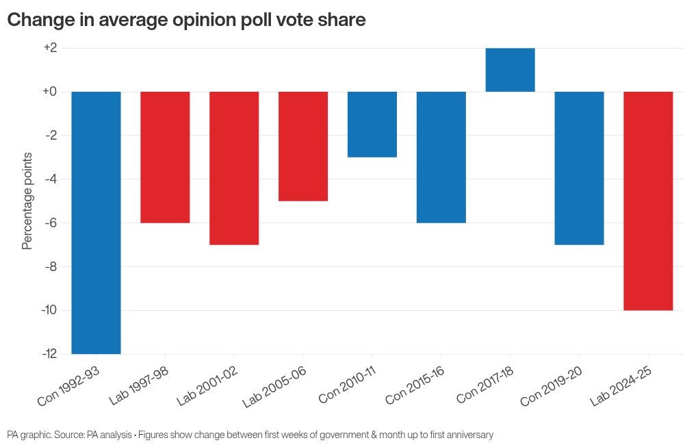 Labour has experienced a significant double-digit decline in public support since the general election a year ago, marking the first such drop for a governing party since John Major's Conservative administration in the 1990s.
