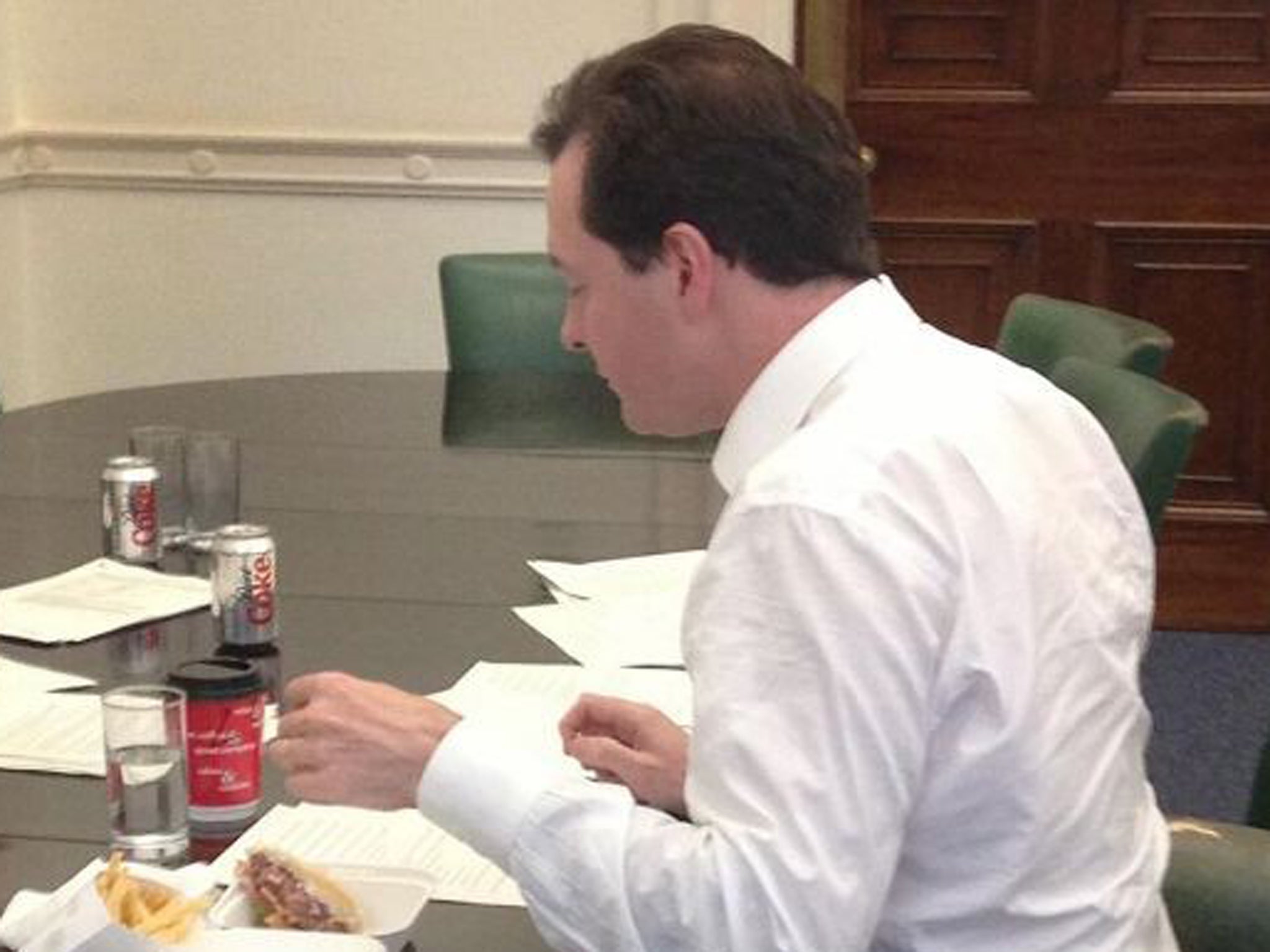 Mr Osborne tweeted a picture of himself eating the burger, from upmarket chain Byron, as he put the final touches to his spending review which saw £11.5 billion worth of cuts.