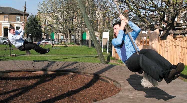 Ministers Ed Balls, right, and Andy Burnham, far right, playing on the swings at Slade Gardens adventure playground in Brixton, London, yesterday to launch a consultation document on Play Strategy.